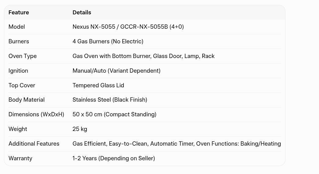 Elevate your cooking experience with the Nexus NX-5055 Gas Cooker (GCCR-NX-5055B 4+0) – a compact 50x50cm standing cooker featuring 4 high-efficiency gas burners and a versatile gas oven for baking, grilling, and roasting. Designed for Nigeria’s busy lifestyles and gas cylinder use, this black stainless steel cooker offers super-fast heating, low gas consumption, and easy maintenance. Perfect for families, apartments, bukas, or caterers – cook multiple dishes simultaneously while baking cakes, pies, or jollof in the spacious oven. Say goodbye to slow stovetops and hello to reliable performance that handles daily demands without fuss.